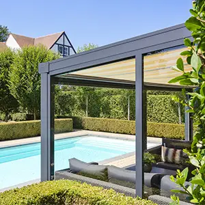 De moderne pergola met oprolbaar doek biedt schaduw, comfort en bescherming tegen lichte regen.